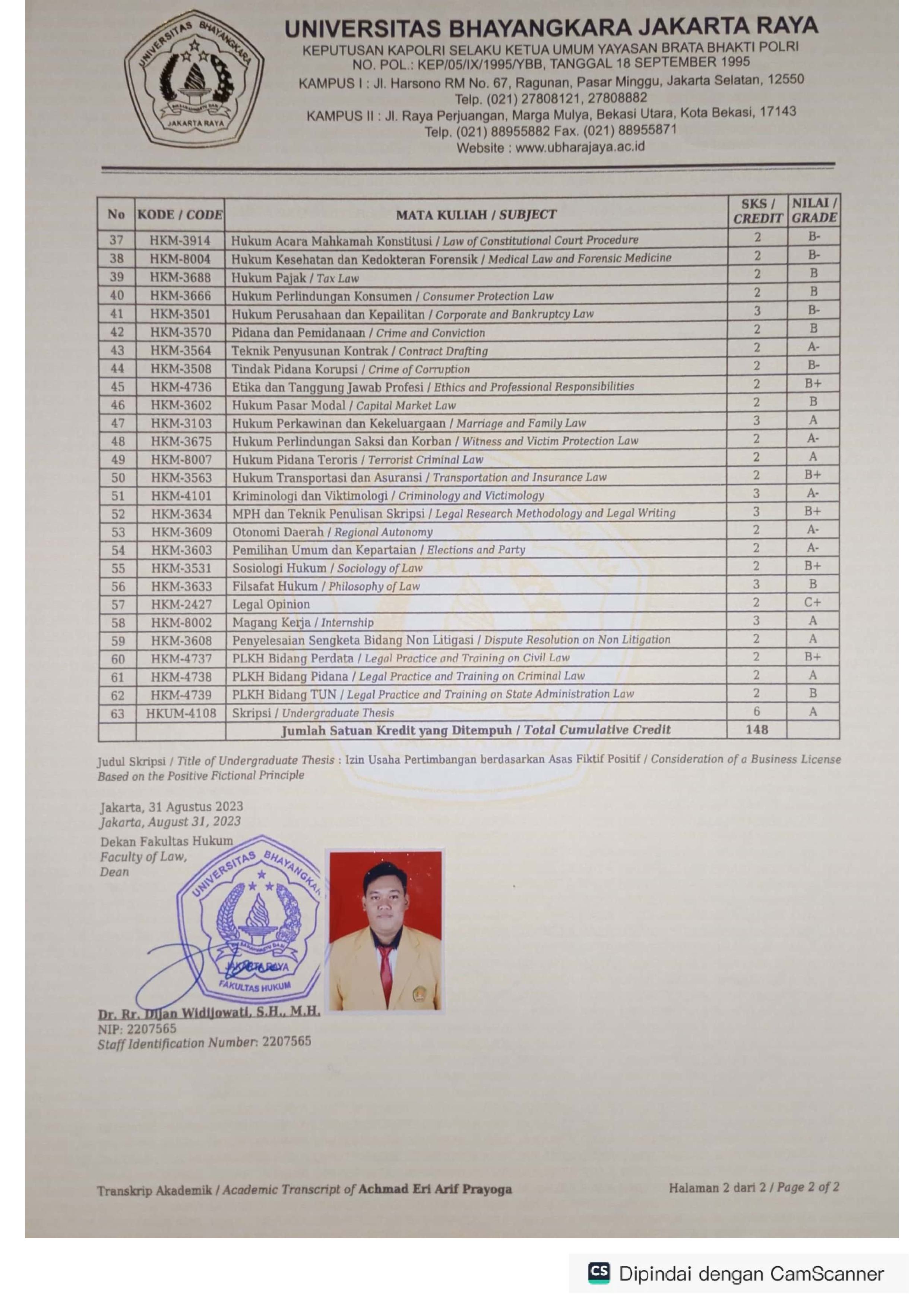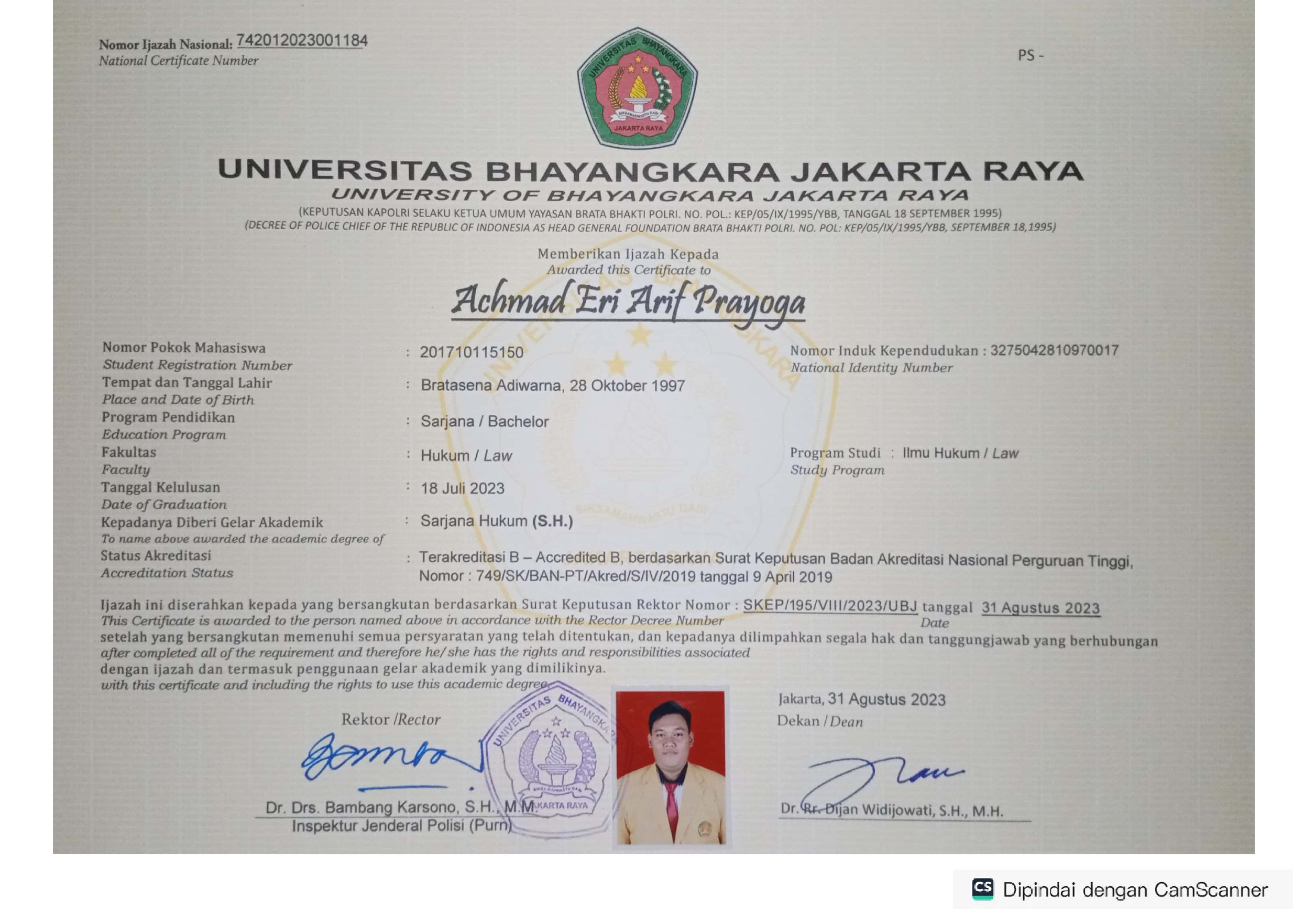 Saya adalah lulusan dari Universitas Bhayangkara Jakarta di bidang Hukum, dengan Prodi Ilmu Hukum dan berfokus pada Hukum Tata Negara, serta Hukum Perdata dan Hukum Pidana yang memiliki kepribadian baik, berpengetahuan luas, serta mampu melaksanakan tugas sesuai dengan nilai-nilai Pancasila.